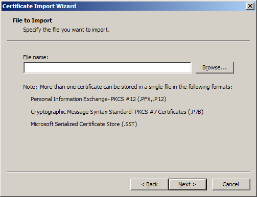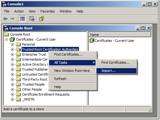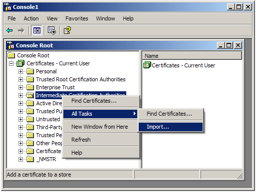 - Complete the import wizard again, but this time locating the UTNAddTrustServerCA Certificate when prompted for the