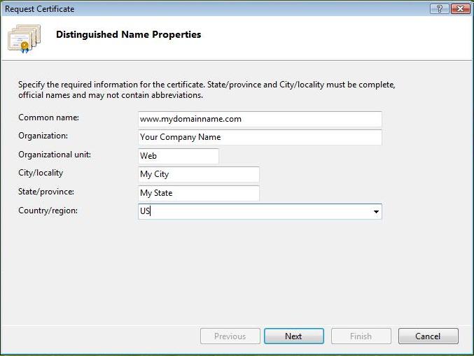 - The Common Name field should be the Fully Qualified Domain Name (FQDN) or the web address for which you plan to use your IIS SSL Certificate. You will need to insure that the common name submitted in the CSR is the correct domain name / FQDN that you intend to use the certificate for. For wildcard SSL certificates the common name should contain at least one asterisks (*) e.g. *.comodo.com,*.instantssl.com,etc